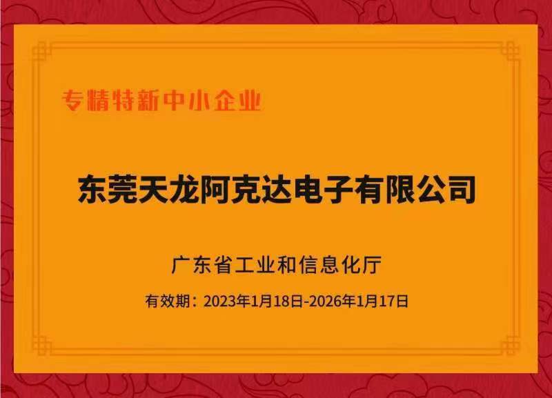 近日,公司全資子公司東莞天龍阿克達(dá)電子有限公司被廣東省工業(yè)和信息化廳評為“2022年專精特新中小企業(yè)”榮譽(yù)稱號。